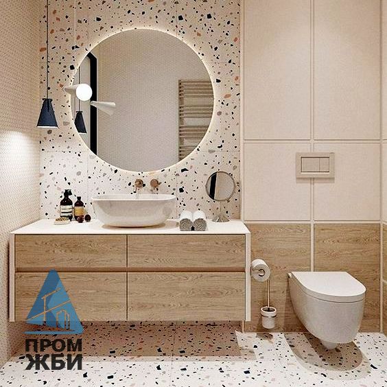 Мебель и аксессуары терраццо для ванной комнаты производят из особого раствора, в составе которого: